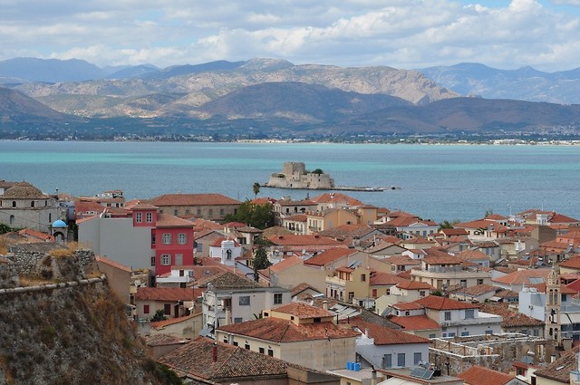 Dotarliśmy także do przepięknego miasteczka Nafplion na Peloponezie, które w latach 1929 do 1834 było stolicą państwa greckiego. Chętni mogli dotrzeć łodzią motorową do obronnego zamku zbudowanego na pobliskiej malutkiej wysepce. Do fortecy Palamidi można było dojść pieszo schodami . Wspinaczka po 899 stopniach nieco dała się we znaki śmiałkom, bo nie wszyscy zdecydowali się dotrzeć do samego szczytu, ale nagrodą za podjęty trud były przepiękne widoki na miasto i morze.