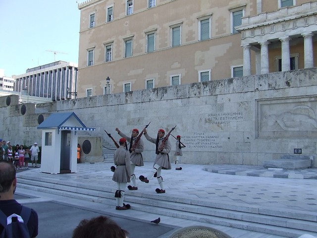 Wielkim zainteresowaniem cieszyła się zmiana warty przy Grobie Nieznanego Żołnierza w Atenach. W formacji tej służą żołnierze wybrani i dobrani spośród wysokich przystojnych mężczyzn. Podczas pełnienie służby stoją nieruchomo przez pół godziny. Bardzo rozbudowana jest ceremonia zmiany warty prowadzona według ściśle określonych zasad. Żołnierze ubrani są w krótkie spódniczki zaprasowane w 400 fałd dla upamiętnienia 400 lat niewoli tureckiej. Na głowie mają czapki z frędzlami, a na nogach białe getry z pomponami. Można było sobie z nimi zrobić pamiątkowe zdjęcia. Obok placu zmiany warty spacerują stada oswojonych gołębi , dziobiąc okruszyny chleba i ziarna zbóż z dłoni i siadając na ramionach, a nawet głowach obecnych. Sytuacje bywały bardzo zabawne.