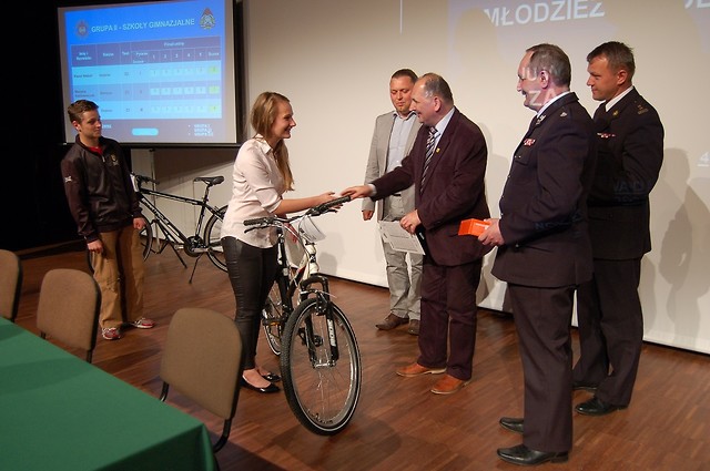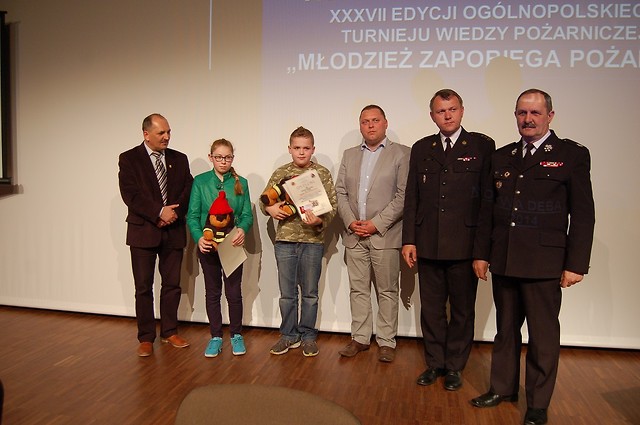Cenne nagrody w konkursie ufundował Starosta tarnobrzeski Krzysztof Pitra. Były to: za zajęcie I-go miejsca – rower, II miejsce – tablet, III miejsce – słuchawki. Ponadto każdy z uczestników otrzymał za udział w turnieju pendrive oraz dyplom. Drugą, ustną część zmagań obserwował także zastępca burmistrza miasta i gminy Nowa Dęba - Zygmunt Żołądź, który jako gospodarz podziękował wszystkim za udział w eliminacjach powiatowych i pogratulował zwyciezcom. Na zakończenie organizatorzy wyróżnili dwoje najmłodszych uczestników konkursu, wręczając im oprócz dyplomów także strażackie maskotki.