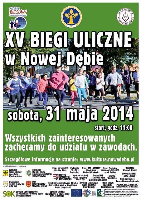 Serdecznie zapraszamy 31 maja 2014 r. (sobota) na XV Biegi Uliczne w Nowej Dębie pod patronatem Nowodębskiego Towarzystwa Społeczno-Kulturalnego, Urzędu Miasta i Gminy, Samorządowego Ośrodka Kultury oraz Samorządowego Ośrodka Sportu i Rekreacji.