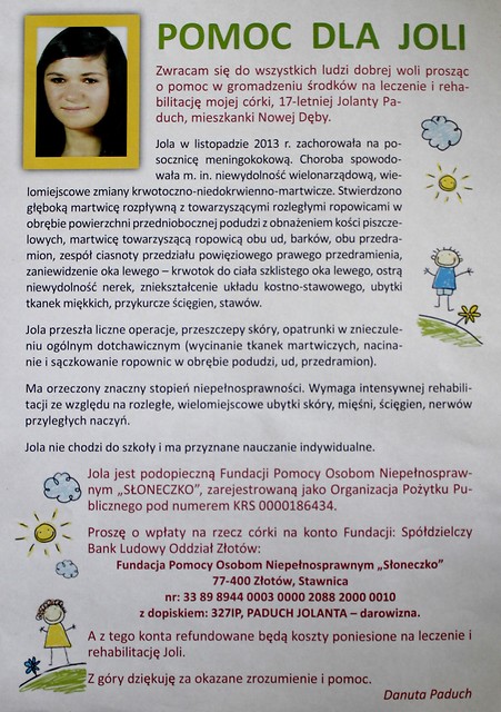 Jola w listopadzie 2013 r. zachorowała na posocznicę meningokokowi. Przeszła liczne operacje, przeszczepy skóry, opatrunki w znieczuleniu ogólnym dotchawicznym. Wymaga intensywnej rehabilitacji ze względu na rozległe, wielomiejscowe ubytki skóry, mięśni, ścięgien, nerwów przyległych naczyń.