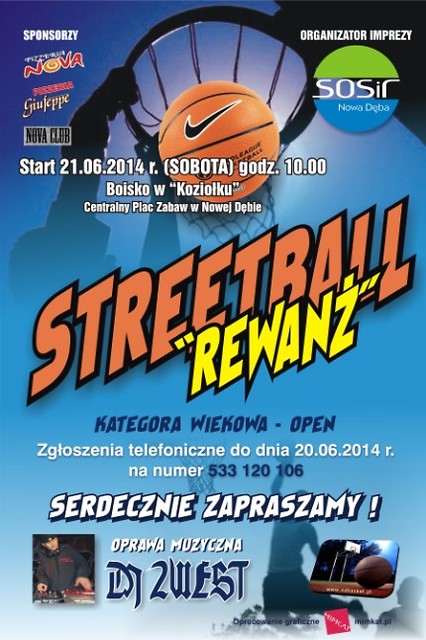 Samorządowy Ośrodek Sportu i Rekreacji w Nowej Dębie zaprasza do udziału w turnieju koszykówki ulicznej, który odbędzie się w dniu 21 czerwca 2014 r. (sobota) o godz. 10.00 na boisku w ''Parku Miejskim''.