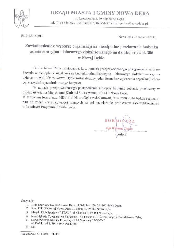 Zawiadomienie o wyborze organizacji na nieodpłatne przekazanie budynku