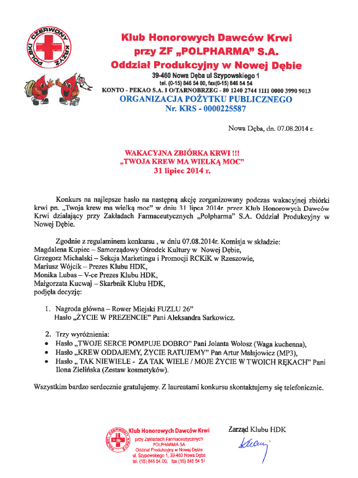 Akcja oddawania krwi - wyniki konkursu