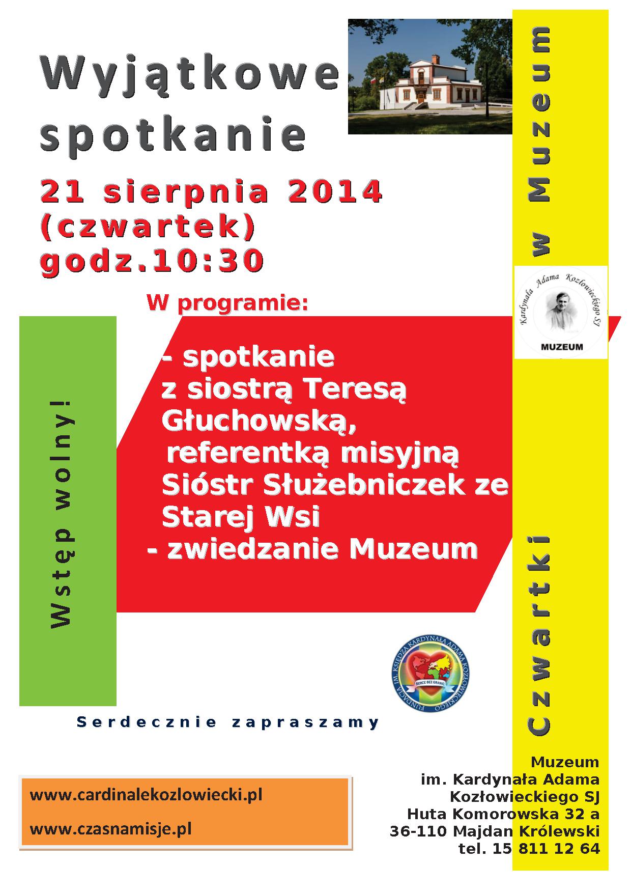 Fundacja im. Księdza Kardynała Adama Kozłowieckiego „Serce bez granic” i Muzeum Kardynała Adama Kozłowieckiego SJ w Hucie Komorowskiej serdecznie zapraszają na spotkanie z s. Teresą Głuchowską, która jest Referentką Misyjną Zgromadzenia Sióstr Służebniczek Najświętszej Maryi Panny Niepokalanie Poczętej w Starej Wsi. Spotkanie odbędzie się w czwartek, 21 sierpnia 2014 r. o godz. 10:30, w ramach „Czwartków w Muzeum”.