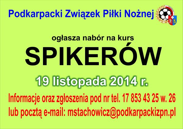 Zgodnie z wcześniejszymi informacjami Podkarpacki ZPN organizuje w dniu 19.11.2014 r w hotelu Nowy Dwór w Świlczy kurs spikerów uprawniający do prowadzenia spikerki na zawodach piłki nożnej IV ligi i niższych klas rozgrywkowych.
