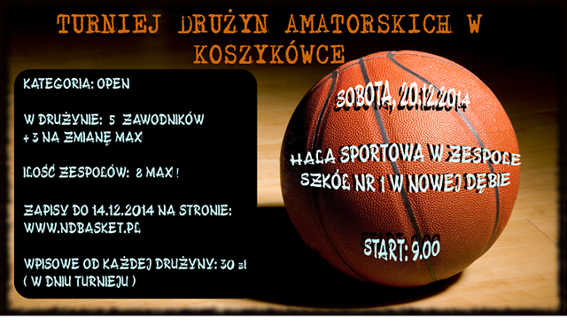 Zapraszamy do udziału w Turnieju drużyn amatorskich w koszykówce, współorganizowanym przez Samorządowy Ośrodek Sportu i Rekreacji w Nowej Dębie. Turniej odbędzie sie w dniu 20 grudnia 2014 r. (tj. sobota) o godz. 9.00 w hali sportowej Zespołu Szkół nr 1 w Nowej Dębie.
