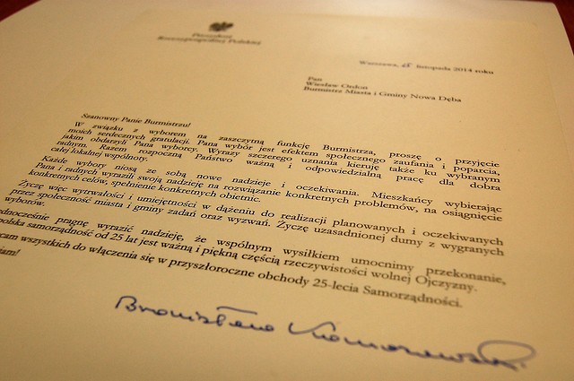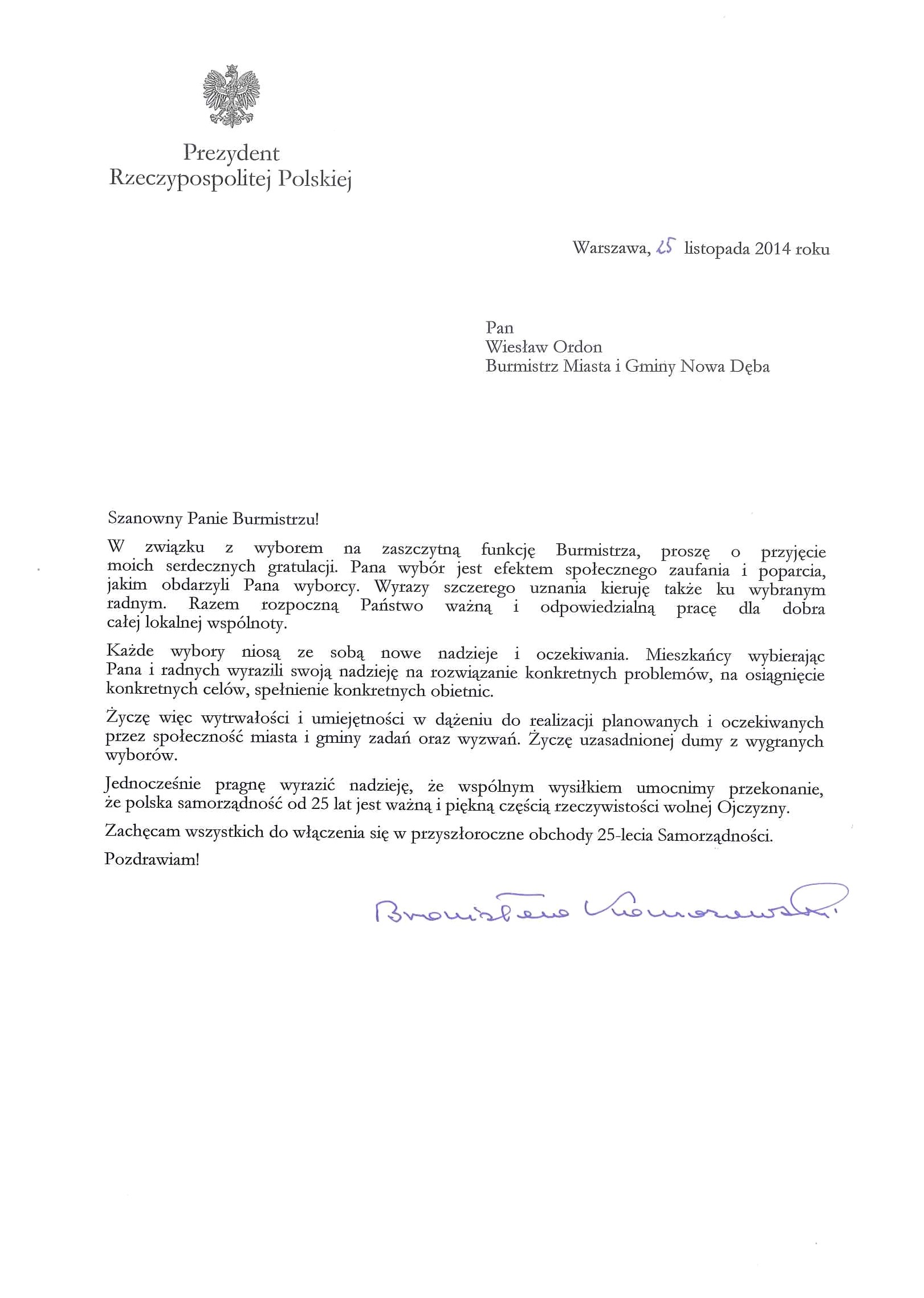 Prezydent Rzeczypospolitej Polskiej - Bronisław Komorowski, pogratulował Wiesławowi Ordonowi - Burmistrzowi Miasta i Gminy Nowa Dęba oraz nowo wybranym radnym VII kadencji.