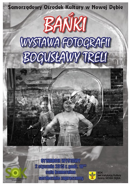 Samorządowy Ośrodek Kultury zaprasza na wystawę fotografii p. Bogusławy Treli pt. ,,Bańki”, która odbędzie się 2 stycznia 2015 r. o godz. 18:00 w sali kameralnej SOK. Obejrzymy cykl zdjęć powstały w opozycji do kultury konsumpcyjnej, z potrzeby radości i zachwytu nad tym, co ulotne. Fotografie są efektem kilkunastu wypraw na podwórza jednej z dzielnic Wrocławia - Nadodrza. Dzięki kolorowym bańkom miejsca te na chwilę zmieniały swoje ponure oblicza. Podobnie bańki oddziaływały na ich mieszkańców.