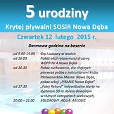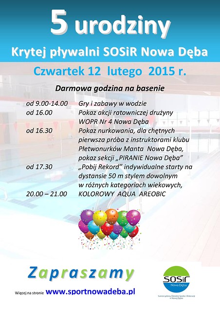Zapraszamy Wszystkich bardzo serdecznie na obchody 5 rocznicy otwacia Krytej Pływalni SOSiR