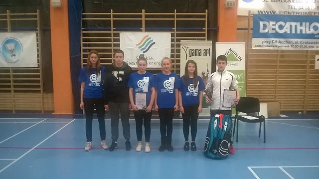 Na zdjęciu ekipa badmintonowych młodzików Stali Nowa Dęba w Olsztynie k/ Częstochowy, stoją od lewej: Beata Mycek, Patryk Róg, Natalia Róg, Aleksandra Michalczuk, Zofia Tomczyk, Rafał Lejko.