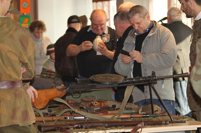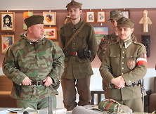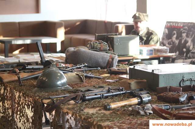 DIORAMA PARTYZANCKA w sali kameralnej SOK rozpoczęła się wykładem dotyczącym Podziemia Niepodległościowego NSZ, AK, WiN „Żołnierzy Wyklętych”. W poruszający sposób przedstawiono dramatyczne losy wielu żołnierzy, min. Witolda Pileckiego i jego rodziny. Kolejnym punktem spotkania była prezentacja i omówienie umundurowania oddziałów partyzanckich NSZ, AK, WiN oraz WP z 1939 r. Członkowie grupy wykazali się ogromną wiedzą z zakresu historii i militariów, zaprezentowali również repliki broni w oddziałach partyzanckich oraz broni deko-PCU (czyli pozbawionej cech użytkowych i zarejestrowanych na Policji w Rzeszowie). Broń można było wziąć do ręki, zadawać pytania. Nowodębscy pasjonaci historii podziwiali: mausera, pepeszę, parabellum, stena, radomiaka (pistolet polskiej konstrukcji) i „piłę Hitlera”- karabin maszynowy MG 42, który zrobił na zebranych największe wrażenie. Była to żywa lekcja historii, patriotyzmu i niezwykłe spotkanie pokoleń.