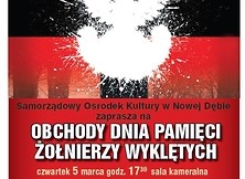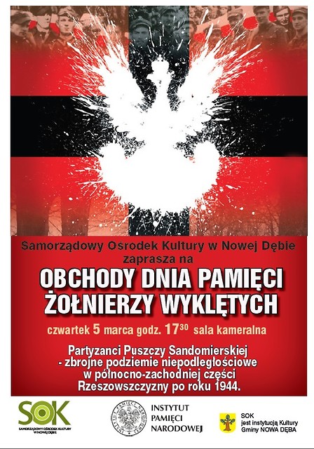 W związku z Dniem Pamięci Żołnierzy Wyklętych Samorządowy Ośrodek Kultury w Nowej Dębie serdecznie zaprasza wszystkich chętnych na wykład pana Mirosława Surdeja z Instytutu Pamięci Narodowej w Rzeszowie. Temat spotkania: Partyzanci Puszczy Sandomierskiej - zbrojne podziemie niepodległościowe w północno-zachodniej części Rzeszowszczyzny po roku 1944. Prelekcja odbędzie się w czwartek, 5 marca o godz. 17:30 w sali kameralnej SOK.