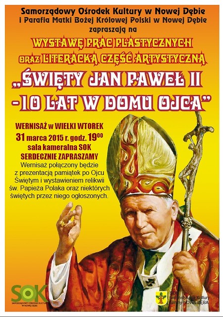 Zapraszamy do Samorządowego Ośrodka Kultury w Nowej Dębie na wystawę pt. "Święty Jan Paweł II - 10 lat w Domu Ojca". Wernisaż z prezentacją pamiątek po Ojcu Świętym i wystawieniem relikwii św. Papieża Polaka oraz niektórych świętych przez niego ogłoszonych odbędzie się w Wielki Wtorek, 31 marca o godz. 19:00 w sali kameralnej SOK w Nowej Dębie.