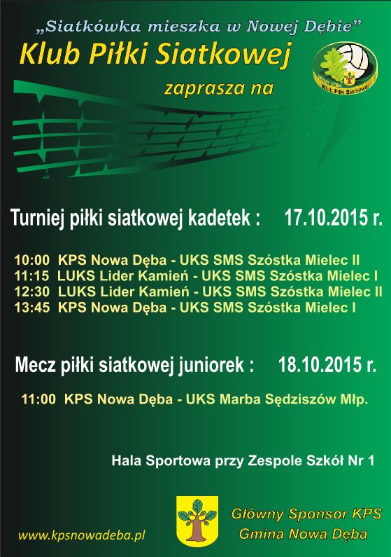 W dniach 17-18 października 2015 r. na hali sportowej przy Zespole Szkół Nr 1 rozegrane zostaną mecze w ramach podkarpackiej ligi kadetek i juniorek w piłce siatkowej. Szczegółowy program zawodów znajduje się na plakacie.