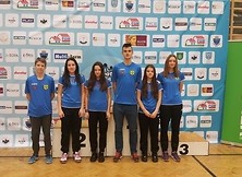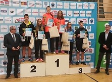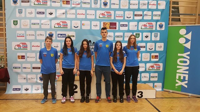 Na zdjęciach badmintoniści Stali Nowa Dęba podczas ceremonii dekoracji w Przemyślu: Jakub Suszyński, Aleksandra Michalczuk, Dominika Luboch, Patryk Kopeć, Zofia Tomczyk i Beata Mycek.