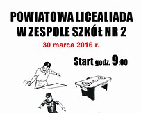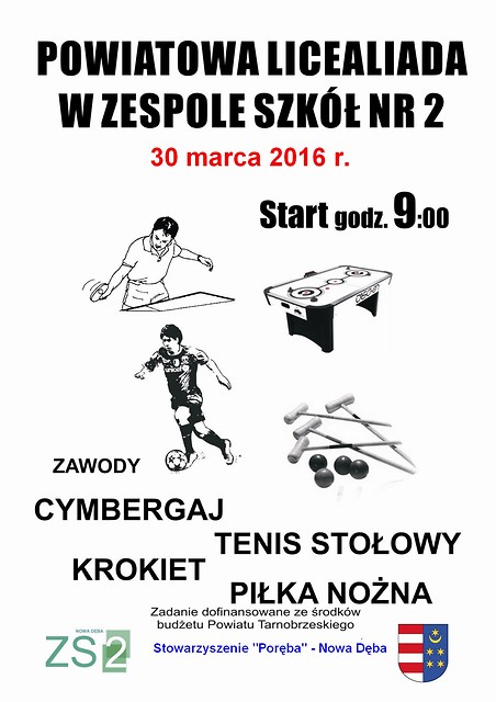 Stowarzyszenie "Poręba" działające przy Zespole Szkół nr 2 w Nowej Dębie serdecznie zaprasza uczniów szkół gimnazjalnych i ponadgimnazjalnych do udziału w Powiatowej Licealiadzie organizowanej 30 marca na terenie ZS nr 2. Zadanie dofinansowane ze środków budżetu Powiatu Tarnobrzeskiego.