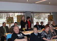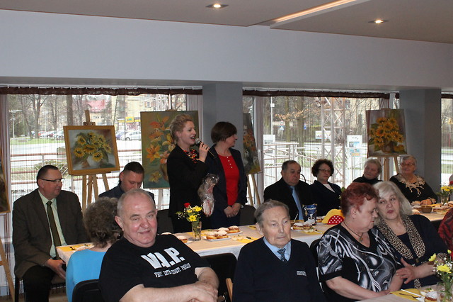 Przewodnicząca J.M. Kaczmarek podziękowała wykonawcom za piękny występ oraz im opiekunom Pani Marii Łącznej i Pani Ewie Kieliszek, która prowadziła konferansjerkę tego spotkania oraz Panu Kamilowi Hinzman za nagłośnienie Imprezy. Po części artystycznej podano kawę i herbatę do pączków produkcji Pana Busia. Obsługą gości zajmowały się Panie z M-G OPS, którym też Przewodnicząca podziękowała serdecznie za Ich bezinteresowną pomoc, wręczając po róży. Szczególne podziękowania były dla Pąństwa Flisów i Firmy Handlowo-Usługowej „Joanna Urban” w N.D. za otrzymane piękne wiązanki do dekoracji stołów, oraz za otrzymane wsparcie finansowe na rzecz Związku. Przewodnicząca podziękowała również za dobre serce Członkowi Zarządu, Panu Bernardowi Wysiadłemu, który zawsze wspiera Zarząd, kiedy potrzebuje pojazdu, a na to „Spotkanie przy jajeczku” zafundował wszystkim zebranym po świeżym jajeczku. Po skończonym spotkaniu, wszyscy zebrani dziękowali Zarządowi za przygotowanie miłego spotkania.