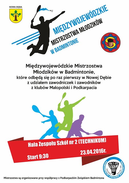 Informujemy, że w dniu 23.04.2016r. (sobota godzina 9.30) rozegrane zostaną w Nowej Dębie w hali sportowej Zespołu Szkół Nr 2 przy ul. Kościuszki 101 Międzywojewódzkie Mistrzostwa Młodzików w badmintonie.
