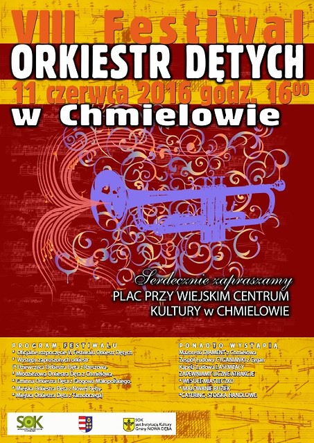 O tym, że jest w orkiestrach dętych wielka siła, nikogo nie trzeba przekonywać. W sobotnie popołudnie 11 czerwca 2016 r. o godz.16:00 w Chmielowie królować będą trąbki, puzony i waltornie. Po raz ósmy w WCK w Chmielowie - filii Samorządowego Ośrodka Kultury w Nowej Dębie, organizowany będzie Festiwal Orkiestr Dętych. To znakomita okazja, aby posłuchać i popatrzeć na widowiskowe występy orkiestr oraz na ciekawe synchronizacje taneczne w wykonaniu Mażoretek „Diament”. W przeglądzie udział wezmą Dziewczęca Orkiestra Dęta z Rzeszowa, Miejska Orkiestra Dęta z Tarnobrzega, Gminna Orkiestra Dęta z Głogowa Małopolskiego, Młodzieżowa Orkiestra Dęta z Chmielowa, Miejska Orkiestra Dęta z Nowej Dęby. Imprezę uświetni występ zespołu „Cyganianki” z towarzyszeniem kapeli ludowej. Jak co roku, nie zabraknie atrakcji dla dzieci - wesołe miasteczko, malowanie buziek. Na wszystkich gości czeka bogaty catering oraz stoiska handlowe. Zapraszamy wszystkich mieszkańców gminy Nowa Dęba i okolic.
