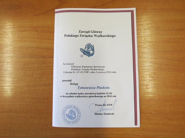 Tymoteusz Plaskota z Nowej Dęby został powołany przez Zarząd Główny PZW na członka kadry narodowej kadetów (U14) w dyscyplinie wędkarstwa spławikowego na rok 2016.