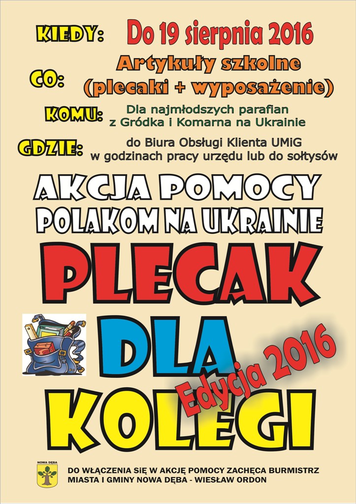 Do 19 sierpnia 2016 r. w ramach akcji "Plecak dla kolegi" na terenie gminy Nowa Dęba będą zbierane artykuły szkolne (plecaki i wyposażenie).