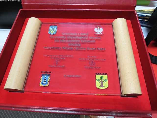 Delegacja samorządu Suhowoli, partnerskiej gminy z Ukrainy, na czele z wójtem Andrzejem Torbą, odwiedziła Nową Dębę w czerwcu podczas ósmej edycji "Militariady". Ukraińska gmina chcąc odnowić kontakty, nawiązane przed 13 laty, zaprosiła delegację z Nowej Dęby na uroczystości z okazji 25. rocznicy niepodległości Ukrainy. Do Suhowoli pojechali przedstawiciele nowodębskiego samorządu, którzy przekazali utrwalone na szkle okolicznościowe gratulacje.