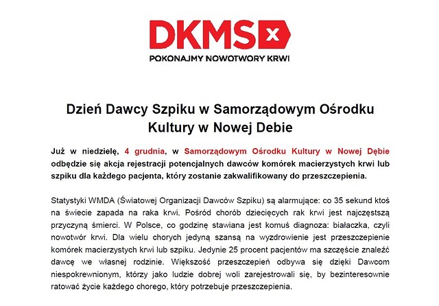 Już w niedzielę, 4 grudnia, w Samorządowym Ośrodku Kultury w Nowej Dębie odbędzie się akcja rejestracji potencjalnych dawców komórek macierzystych krwi lub szpiku dla każdego pacjenta, który zostanie zakwalifikowany do przeszczepienia.