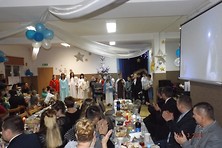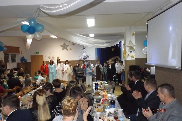 Oczywiście to nie były jedyne życzenia jakie można było usłyszeć tego wieczoru. Głos zabrali również zaproszeni goście. Następnie kilka ciepłych słów oraz życzeń popłynęło z ust naszego nowego proboszcza ks. Piotra Palacza, który pobłogosławił, a tym samym rozpoczął nasze biesiadowanie. Na stołach pojawiły się tradycyjne wigilijne potrawy oraz ciasto przygotowane przez mieszkanki Rozalina.