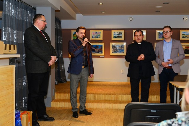 Spotkanie otworzył gospodarz obiektu dyrektor Krystian Rzemień, który powitał wszystkich przybyłych. Głos zabrał również zastępca burmistrza Nowej Dęby Leszek Mirowski który wręczył księdzu Bajcarowi pamiątkową książkę. Następnie w imieniu organizatorów, prezes Stowarzyszenia Przyjazny Samorząd Marek Ostapko przybliżył historie całej akcji – Wszystko zaczęło się kilka lat temy gdy Piotr i Łukasz Mazur oraz Tomasz Mazgaj wraz z drużyną Nowodębskich Patriotów wpadli na pomysł aby wesprzeć rodaków na wschodzie. Bardzo szybko i sprawnie zorganizowali zbiórkę żywności która dzięki ofiarności nowodębian okazała się ogromnym sukcesem. Ale żeby zbiórka mogła się w pełni udać, również po drugiej stronie granicy musiał być ktoś kto będzie mógł poprowadzić te sprawę. Taką osobą okazał się ksiądz Michał Bajcar, który znając polskie rodziny i ich potrzeby, wiedział do kogo i w jakiej formie skierować nowodębską pomoc– mówił.