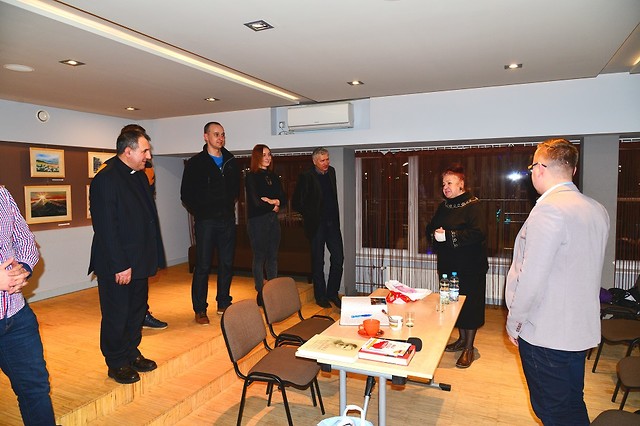 Po obiedzie przyszedł czas na najważniejszy punkt wizyty tj. otwarte spotkanie z mieszkańcami miasta, które odbyło się w sali kameralnej Samorządowego Ośrodka Kultury. Spotkanie było otwarte i darmowe, jednak organizatorzy zwrócili się do mieszkańców o przyniesienie w ofierze polskiej książki dla naszych rodaków na Kresach. Książki te stały się więc swoistym „biletem wstępu”. W sumie zebrano kilkadziesiąt woluminów.