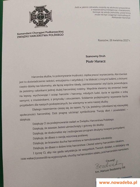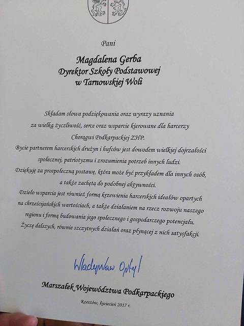 Księdzu Piotrowi serdecznie gratulujemy i życzymy nieustannego zapału i realizacji zamierzeń, a dyrektor Szkoły Podstawowej w Tarnowskiej Woli Magdalenie Gerbie satysfakcji ze wspierania harcerskich inicjatyw.