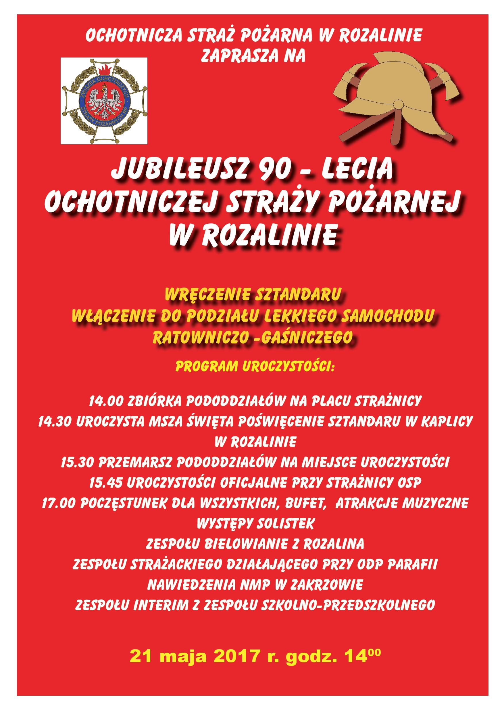 W niedzielę 21 maja odbędą się uroczystości związane z obchodami jubileuszu 90-lecia Ochotniczej Straży Pożarnej w Rozalinie.