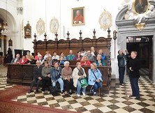 W wycieczce uczestniczyło 53 osoby. Pierwszym punktem wycieczki była Stara Wieś, gdzie mieści się Kolegium Ojców Jezuitów i Bazylika Wniebowzięcia Najświętszej Marii Panny, zbudowana i konsekrowana w 1760 r. przez biskupa Wacława Hieronima Sierakowskiego. W zespole znajduje się muzeum Towarzystwa Jezusowego Prowincji Polski Południowej. Uczestnicy wycieczki zobaczyli bardzo dużo eksponatów sztuki sakralnej z całego świata. W tym Kolegium nowicjat zdobywał Adam Kozłowiecki - późniejszy biskup rodem z Huty Komorowskiej.