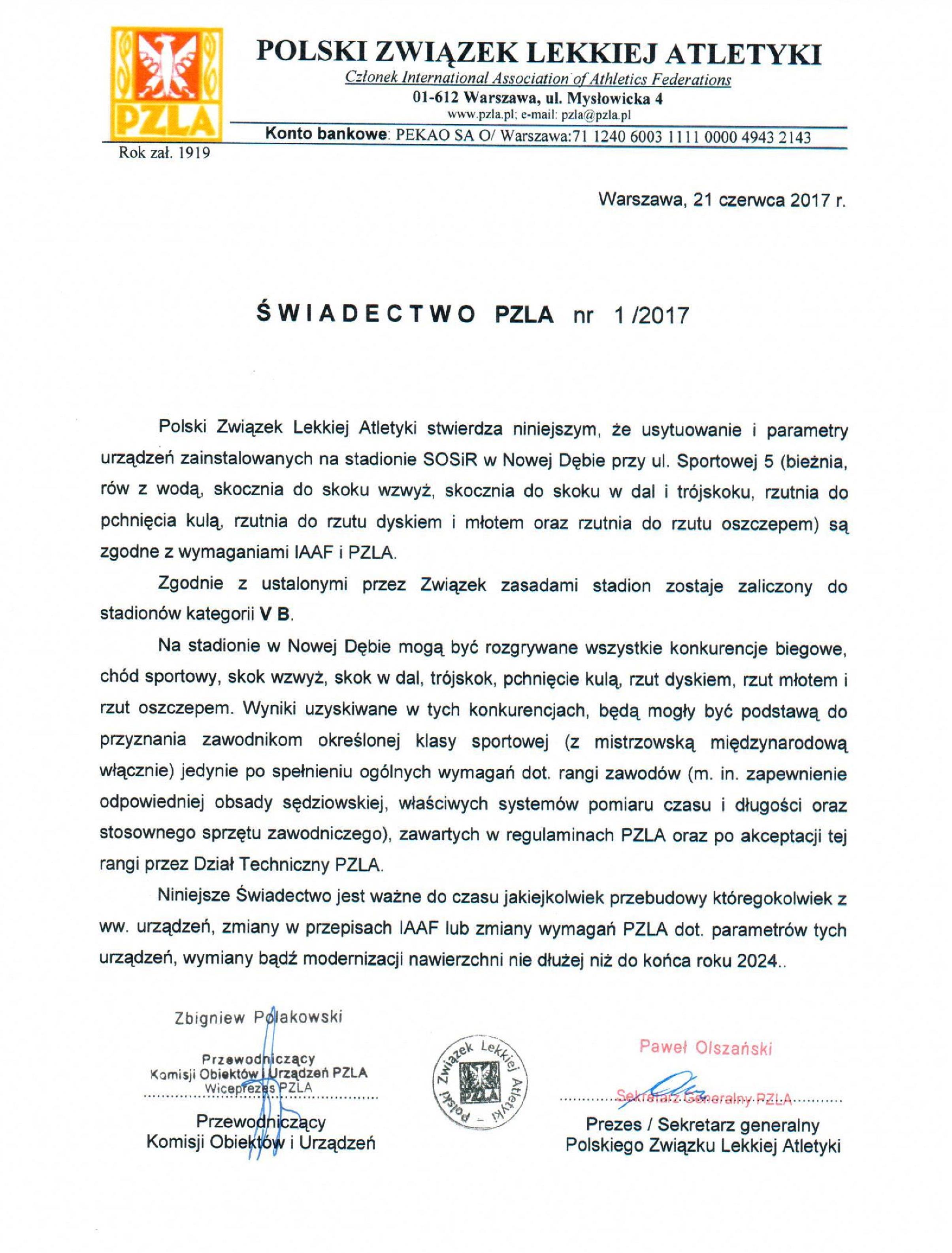 Nowodębski stadion ze świadectwem Polskiego Związku Lekkiej Atletyki.