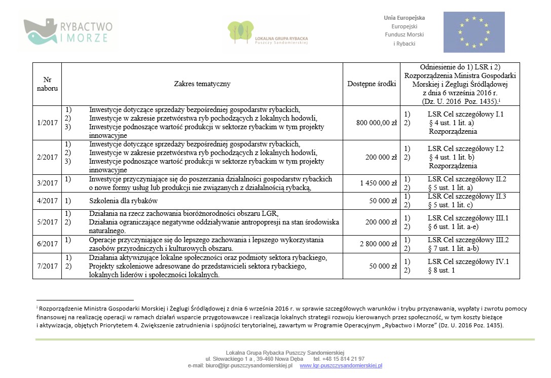 Stowarzyszenie „Lokalna Grupa Rybacka Puszczy Sandomierskiej” (LGR) działające na terenie gmin: Kolbuszowa, Dzikowiec, Baranów Sandomierski, Nowa Dęba, Grębów, Gorzyce, Bojanów, Zaleszany, Radomyśl nad Sanem, Zaklików, Potok Wielki, Modliborzyce, Janów Lubelski ogłasza nabory wniosków o dofinansowanie nr: 1/2017, 2/2017, 3/2017, 4/2017, 5/2017, 6/2017, 7/2017 w ramach działania „Realizacja lokalnych strategii kierowanych przez społeczność” objętych Priorytetem 4. „Zwiększenie zatrudnienia i spójności terytorialnej” zawartym w Programie Operacyjnym „Rybactwo i Morze” na lata 2014-2020 (PO RYBY).