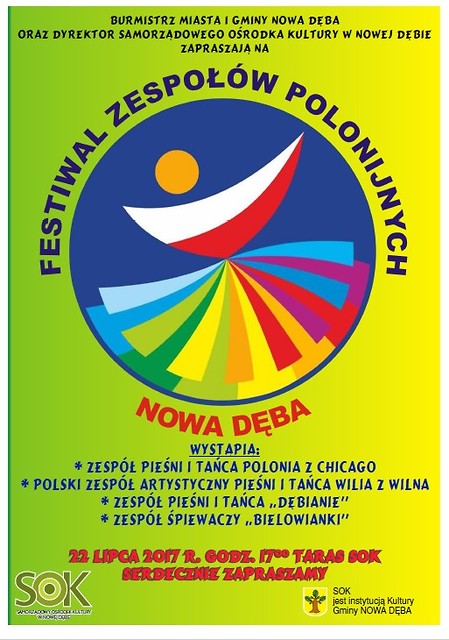 Na zaproszenie SOK i dzięki uprzejmości WDK w Rzeszowie 22 lipca 2017 r. (sobota) będziemy gościć zespoły uczestniczące w XVII Światowym Festiwalu Polonijnych Zespołów Folklorystycznych - Rzeszów 2017. Swoją obecnością zaszczycą nas dwa zespoły: Zespół Pieśni i Tańca POLONIA z Chicago oraz Polski Zespół Artystyczny Pieśni i Tańca WILIA z Wilna.