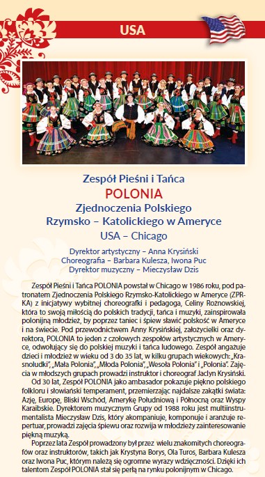 Zespół Pieśni Tańca POLONIA Z Chicago skupia dzieci i młodzież, działa od 30 lat pod patronatem Zjednoczenia Polskiego Rzymsko-Katolickiego w Ameryce.Promuje polską kulturę na terenie USA i za granicą. „Polonia” zapraszana jest na wszystkie większe uroczystości miasta Chicago, uświetnia polonijne festiwale i obchody. Na bogaty repertuar „Polonii” składa się ponad 12 suit, a także polskie tańce narodowe i historyczne. Za zasługi na polu krzewienia polskiej kultury za granicą „Polonia” otrzymała wiele polskich i amerykańskich odznaczeń, m.in. Złoty Medal „Wspólnoty Polskiej”, a także Gloria Artist dla Cecylii Rożnowskiej. Zespól brał udział w festiwalach na terenie m.in.: Brazylii, Bułgarii, Chin, Ekwadoru, Hiszpanii, Izraela, Kanady, USA.
