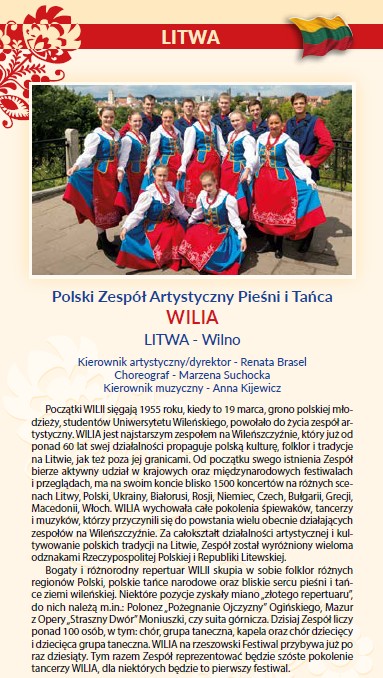 Polski Zespół Artystyczny Pieśni i Tańca „Wilia” jest najstarszym zespołem na Wileńszczyźnie, który już 55 lat propaguje polską kulturę, folklor i tradycje. Zespół bierze aktywny udział w krajowych oraz międzynarodowych festiwalach i przeglądach, ma na swym koncie ponad 1500 koncertów na różnych scenach Litwy i poza jej granicami.Za całokształt działalności artystycznej i kultywowanie tradycji polskich na Litwie zespół został wyróżniony wieloma odznakami Rzeczypospolitej Polskiej i Republiki Litewskiej. Zespół ma w swoim repertuarze polskie tańce narodowe, suity regionalne z prawie wszystkich regionów Polski oraz bliskie sercu pieśni i tańce ziemi wileńskiej.