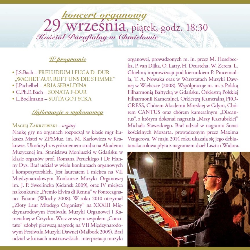 W piątek 29 września o godz. 18:30 w kościele parafialnym w Chmielowie odbędzie się koncert organowy w ramach 4. edycji Festiwalu muzyki kameralnej i organowej "Margaritae Baroci".