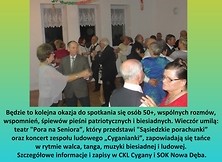 Centrum Kultury Lasowiackiej w Cyganach zaprasza seniorów z gminy Nowa Dęba na coroczne obchody swojego święta w niedzielę 12 listopada 2017 r. o godz. 17:00. Będzie to kolejna okazja do spotkania się osób 50+, wspólnych rozmów, wspomnień, śpiewów pieśni patriotycznych i biesiadnych. Wieczór umilą: teatr "Pora na Seniora”, który przedstawi "Sąsiedzkie porachunki” oraz koncert zespołu ludowego „Cyganianki”, zapowiadają się tańce w rytmie walca, tanga, muzyki biesiadnej i ludowej. Szczegółowe informacje i zapisy: p. Halina Ordon – CKL Cygany (787 620 333) i p. Ewa Kieliszek SOK Nowa Dęba. Zapraszamy!