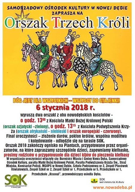 Już po raz dziesiąty na świecie i w Polsce, a po raz czwarty w naszym mieście, przejdzie ulicami Orszak Trzech Króli, aby w dniu Święta Objawienia Pańskiego podążyć za Trzema Królami do Stajenki i ukłonić się Nowo Narodzonemu Dzieciątku Jezus! W roku 2018 orszak przejdzie ulicami ponad 500 miejscowości! 6 stycznia 2018 r. zwykli ludzie: rodziny, sąsiedzi, na ulicach wiosek, miast i miasteczek złączą się razem opowiadając tak, jak potrafią, swoimi słowami i swoim sercem historię sprzed 2000 lat.