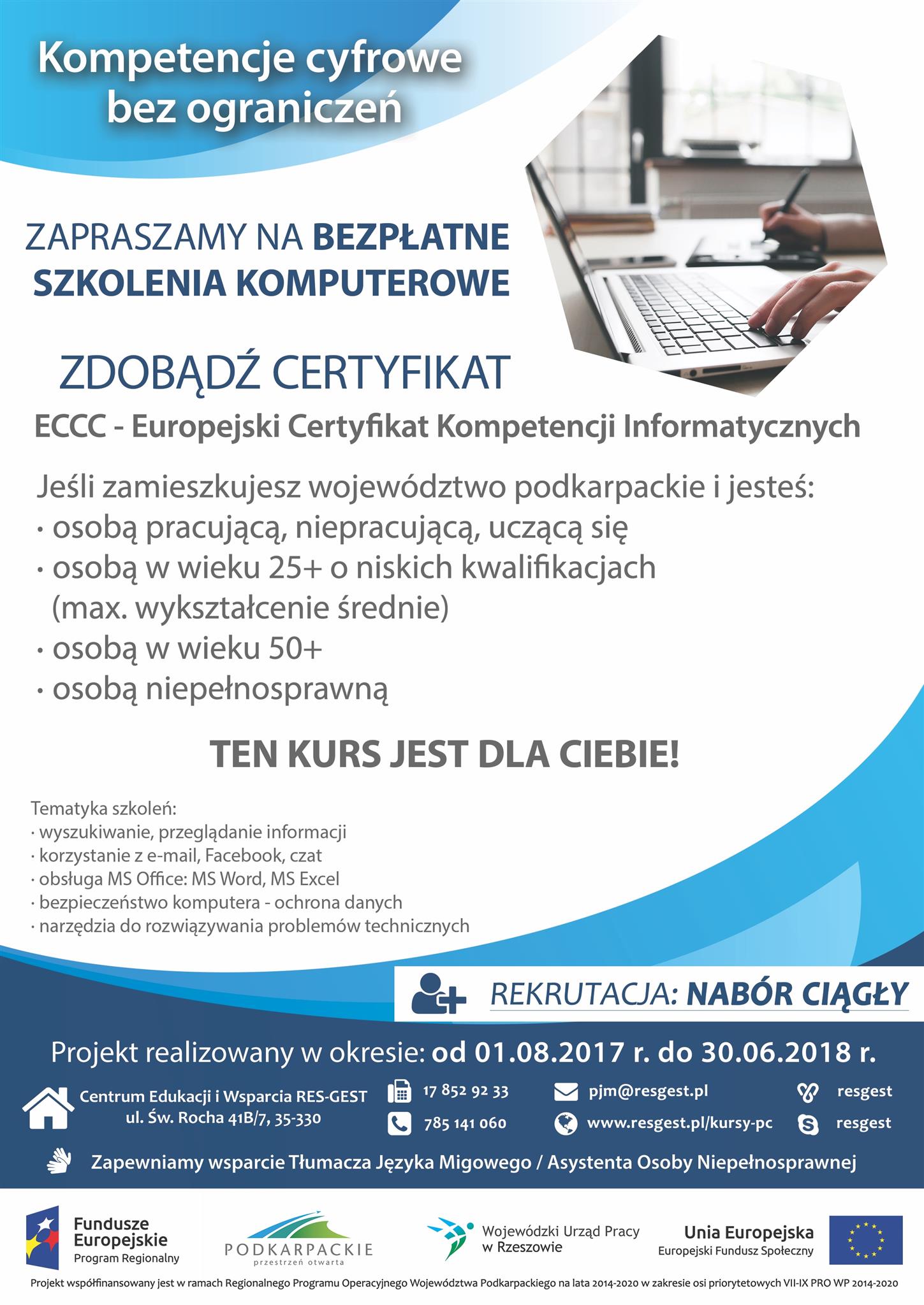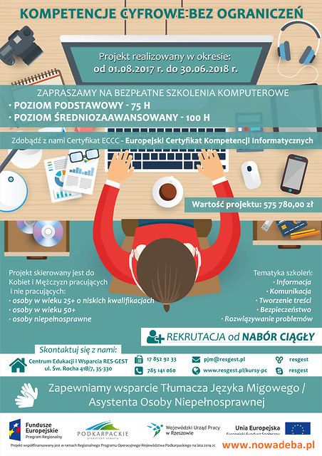 Centrum Edukacji i Wsparcia RES-GEST z Rzeszowa zaprasza na bezpłatne kursy komputerowe na poziomie podstawowym i średniozaawansowanym w ramach projektu "Kompetencje cyfrowe bez ograniczeń". Kurs będzie realizowany na terenie gminy Nowa Dęba. Jest skierowany głównie do osób z terenów wiejskich i pozwala na zdobycie Europejskiego Certyfikatu Kompetencji Cyfrowych. Projekt realizowany jest ze środków Unii Europejskiej.