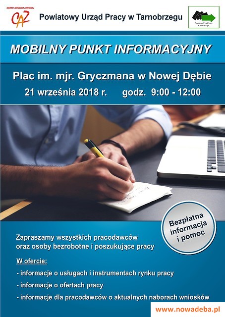 Powiatowy Urząd Pracy w Tarnobrzegu zaprasza do mobilnego punktu informacyjnego, który dostępny będzie na Placu im. mjr. Jana Gryczmana w Nowej Dębie w piątek 21 września 2018 r. w godzinach od 9:00 do 12:00.