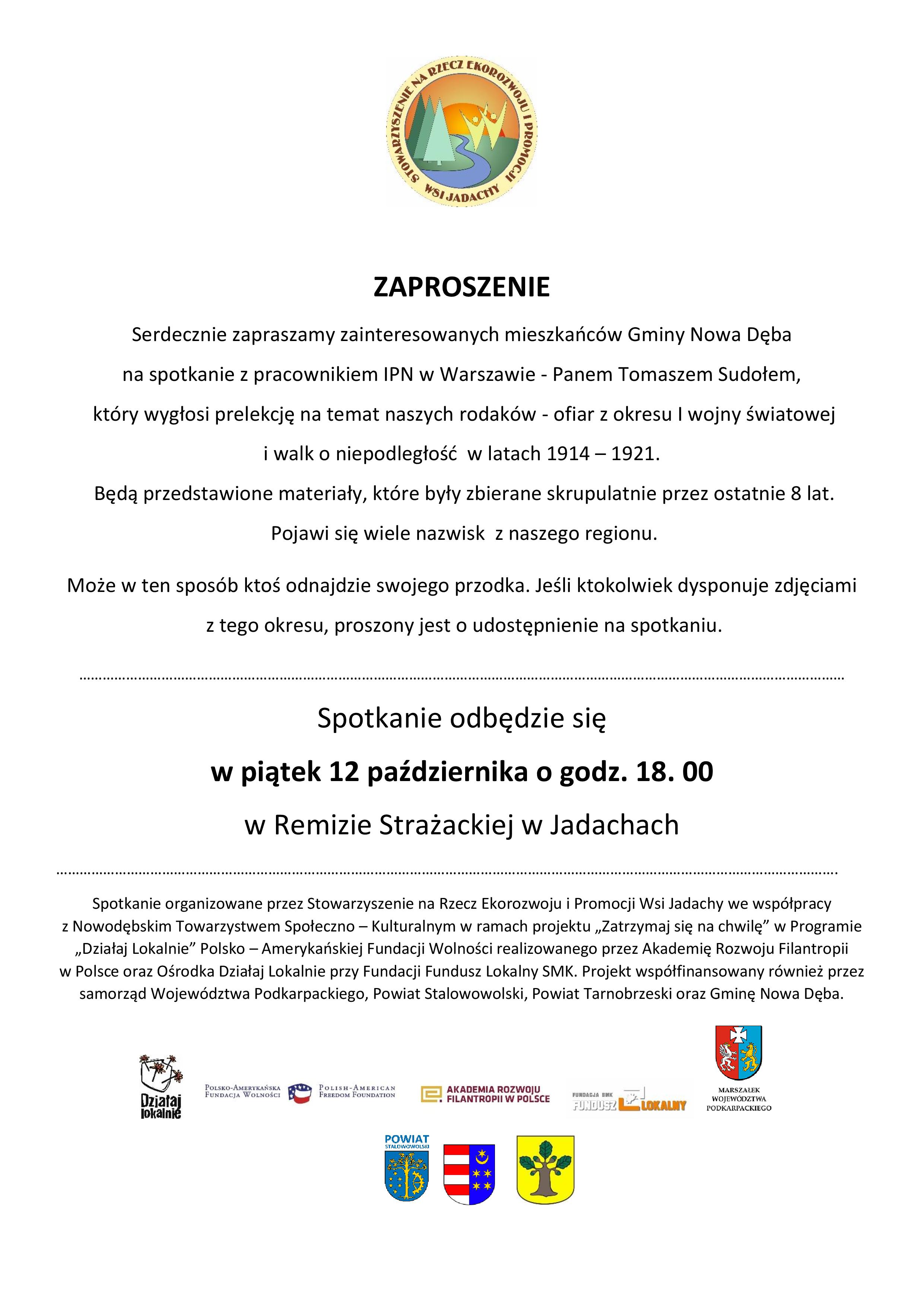 Stowarzyszenie na Rzecz Ekorozwoju i Promocji Wsi Jadachy zaprasza na spotkanie z pracownikiem IPN, który wygłosi prelekcję na temat naszych rodaków - ofiar z okresu I wojny światowej oraz walk o niepodległość z lat 1914-1921.