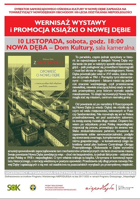 Zapraszamy na towarzyszący nowodębskim obchodom 100-lecia odzyskania niepodległości wernisaż wystawy i promocję książki pt. "Z Niepodległej. Opowieść o Nowej Dębie - mieście powstałym dzięki odzyskaniu przez Polskę suwerenności".