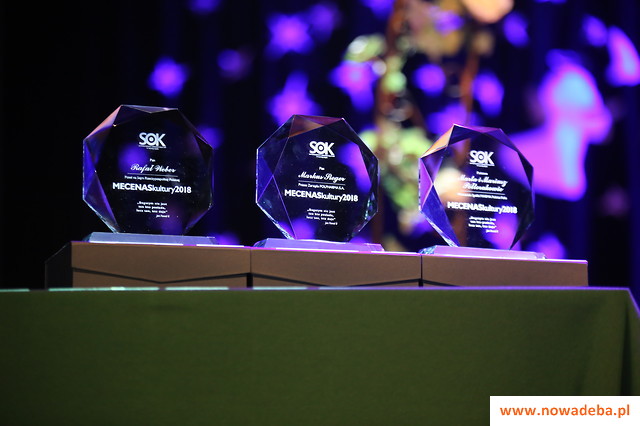 Po powitaniu dyrektor SOK rozpoczął uroczystość od wręczenia statuetek "Mecenas kultury 2018". Uhonorował w ten sposób trzech wybitnych mecenasów kultury Miasta i Gminy Nowa Dęba, którzy w sposób szczególny przyczynili się do krzewienia kultury na naszym terenie. Statuetki otrzymali: Poseł na Sejm RP Rafał Weber (za wspieranie i patronat nad realizowanymi przez SOK projektami ministerialnymi), Markus Sieger – Prezes Zarządu firmy Polpharma (za wieloletnie wspieranie mecenatem Festiwalu Muzyki Kameralnej i Organowej "Margaritae Baroci" oraz włączanie się spółki w inne przedsięwzięcia kulturalne w Gminie Nowa Dęba) oraz Państwo Marta i Mariusz Półtorakowie – właściciele firmy Marma Polskie Folie (za ogromny wkład finansowy w ufundowanie Pomnika Niepodległości odsłoniętego 11 listopada br. oraz włączanie się w różne wydarzenia w sferze kultury w naszej gminie). Statuetki razem z dyrektorem Rzemieniem wręczyli: poseł na Sejm RP Zbigniew Chmielowiec, starosta Jerzy Sudoł oraz burmistrz Nowej Dęby Wiesław Ordon, którzy również dziękowali za wkład nagrodzonych w budowanie lokalnej kultury. Słowa podziękowania za wyróżnienie skierowali do publiczności Rafał Weber i Monika Lubas (w imieniu firmy Polpharma). Dziękujemy naszym tegorocznym Mecenasom za ich prężną działalność w sferze kultury i zachęcamy do kontynuacji!
