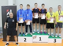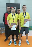 Na zdjęciu badmintonowi dominatorzy z Nowej Dęby w Tarnowie, w żółtych koszulkach stoją od lewej strony: Tadeusz Szczur i Mieczysław Sitko oraz na podium dla zwycięzców.