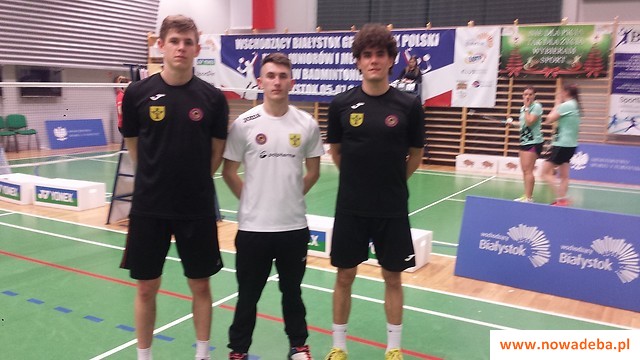 Na zdjęciach trójka badmintonowych muszkieterów z Stali Nowa Dęba: Tymoteusz Malik, Rafał Lejko i Szymon Malik na badmintonowych kortach w Białymstoku.
