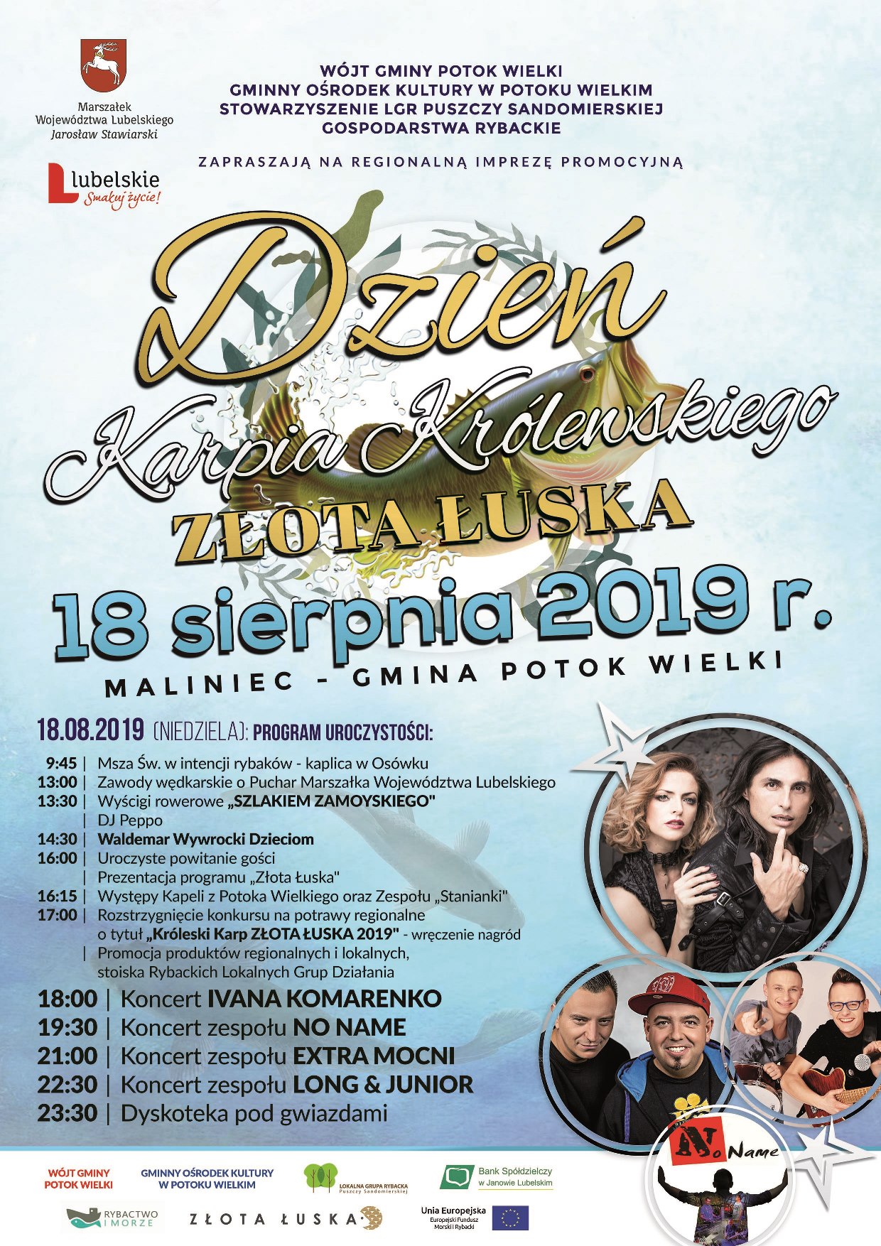 Serdecznie zapraszamy do udziału w „Dniu Karpia Królewskiego - Złota Łuska 2019”, regionalnej imprezie promocyjnej, która odbędzie się 18 sierpnia 2019 roku w Malińcu (gmina Potok Wielki, województwo lubelskie).